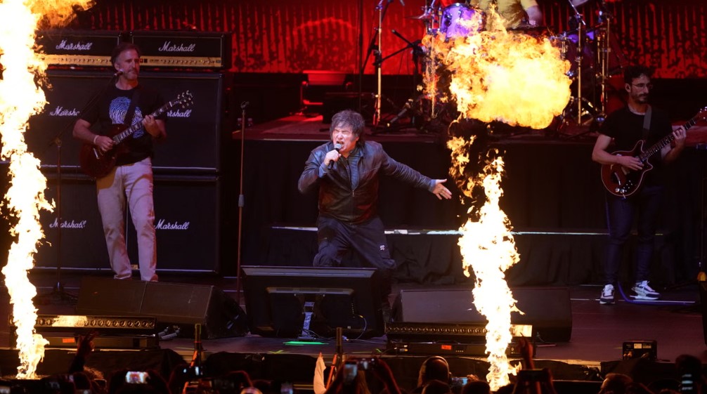 Milei se deleitó con la adulación, levantando los brazos enfundados en cuero y tomando un sorbo de agua antes de continuar con su repertorio de nueve canciones, compuestas principalmente por himnos del rock de los 80. “Soy humano”, dijo al estadio abarrotado. “Quizás no lo parezca, pero lo soy”.