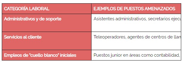Los puestos de mayor riesgo son aquellos que involucran tareas repetitivas, predecibles y basadas en el procesamiento de información. Según los análisis, los más vulnerables incluyen: