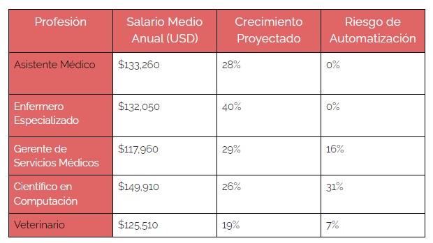 Frente a este panorama, un informe de Resume Genius citado por Entrepreneur identifica las profesiones mejor remuneradas y con menor riesgo de automatización. Todas ellas comparten una característica fundamental: la necesidad de habilidades humanas difíciles de replicar, como la empatía, el juicio clínico en situaciones complejas y la presencia física.