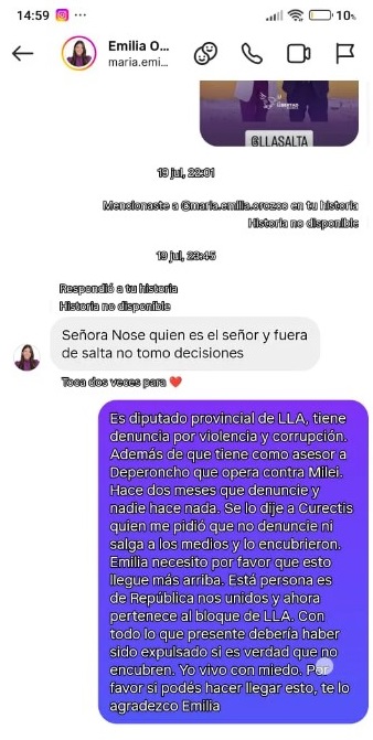 Según el relato de P.A., víctima de violencia y corrupción por parte del legislador, tras la inacción de otros dirigentes (nombrar los dirigente), decidió contactar a Orozco por mensaje directo de Instagram. En la captura de pantalla presentada, P.A. le detalla a la diputada: “Es diputado provincial de LLA, tiene denuncia por violencia y corrupción. Además de que tiene como asesor a Deperoncho -Augusto Ginner- que opera contra Milei… Emilia necesito por favor que esto llegue más arriba… Con todo lo que presente debería haber sido expulsado si es verdad que no encubren. Yo vivo con miedo”. La víctima finaliza el mensaje pidiéndole por favor que lo haga llegar a las más altas esferas del partido.