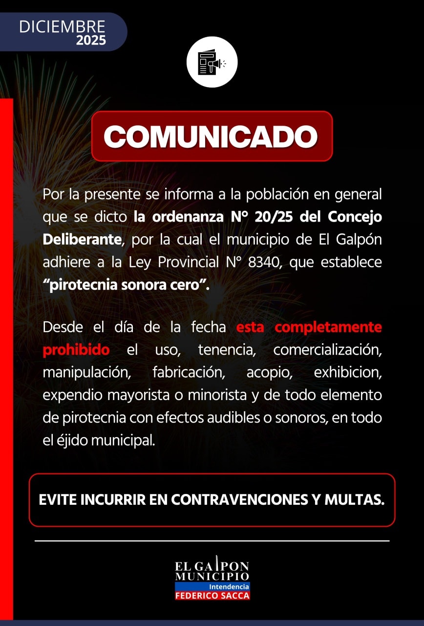 En estas semanas donde el municipio empieza a vivir el clima festivo, la Municipalidad recuerda a la comunidad que ya rige la Ordenanza Nº 20/25, que adhiere a la Ley Provincial Nº 8340 e implementa el régimen de pirotecnia sonora cero.