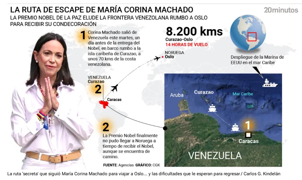 Finalmente cruza a Curazao, donde tomó un avión que la llevó supuestamente primero a Estados Unidos y desde Estados Unidos vuela hacia Noruega. Recordemos que María Corina Machado no tiene pasaporte, entonces tampoco puede volar tan fácilmente sin el apoyo de gobiernos, porque no tiene documento de identidad venezolano vigente, por lo menos. Eso es lo que se ha informado. Sabemos que María Corina Machado llegó a Noruega en un avión privado, no una aerolínea comercial. Ese vuelo aparentemente pertenece a una flota de Estados Unidos y que también por eso ella mencionaba hoy que había recibido ayuda de Estados Unidos para esa suerte de escape. Pero también con la información que se ha difundido de que, como su paso incluía un trecho por mar, hacia la costa de Curazao, tuvo que haber coordinación con las flotas y los radares y demás de sistemas de defensa y tal de Estados Unidos que están desplegados en el Caribe para que hubiese una conciencia de que ese bote, esa lancha donde la iban llevando a ella no representaba un peligro ni mucho menos, sino que más bien conducía a María Corina Machado.