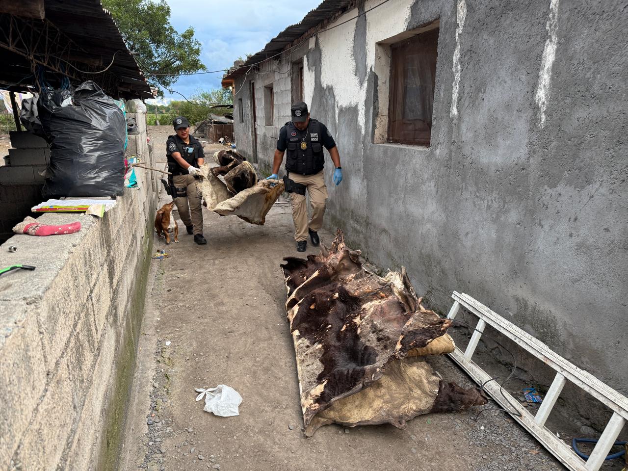 En cuanto a los secuestros, se incautaron ocho teléfonos celulares, un automóvil, dos camionetas, ocho cueros de animal vacuno completos, cuatro lonjas o retazos de cuero, herramientas de faena como serruchos, sierras, machete y hacha, así como seis cuchillos de distintos tipos utilizados habitualmente en faena clandestina. También se incautaron un delantal de carnicero, una chaira, una balanza, un arma blanca tipo hechiza, dos tramos de soga y diversas piezas de carne vacuna cruda —cabeza, costilla, tripas, hígado y panza— presuntamente derivadas de faena sin control sanitario.