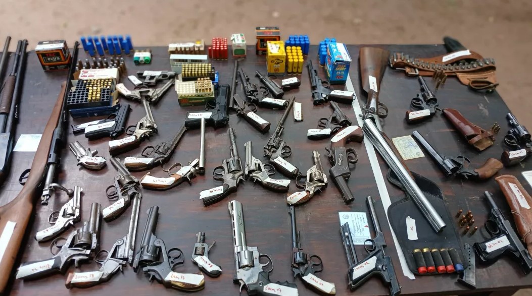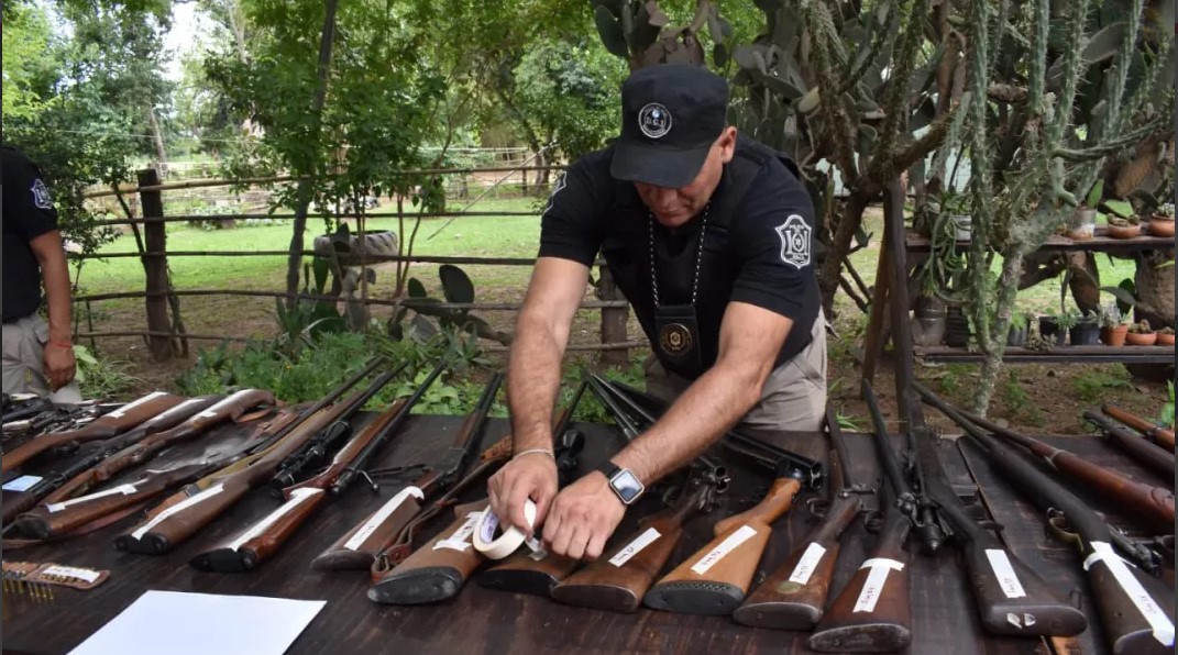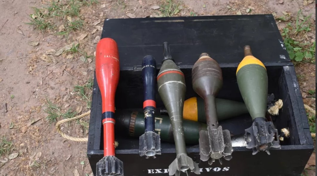 El arsenal secuestrado es el siguiente: 2 granadas TMK, con carga explosiva; 3 granadas de mano FM1; 1 espoleta de impacto; 1 subcalibre de 25 mm.; 2 granadas de fusil de 40 y 65 mm.; 4 proyectiles de artillería y 1 proyectil de artillería de 155 mm., con base simulativa a un cohete; 1 revólver Smith & Wesson, calibre 38 con 6 cartuchos 750; 1 revólver Smith & Wesson, calibre 22; 1 revólver Potents Peding; 1 pistola 1125 Colt, con cargador y funda de cuero; 1 pistola Walther, calibre 9 mm., con cargador y funda de cuero; 1 escopeta doble cañón, cailbre 16; 28 cartuchos calibre 38, con funda y correaje de cuero; 8 cartuchos 9 mm.; 8 cartuchos 11.25; 6 cartuchos calibre 22 corto; 5 cartuchos de escopeta, calibre 16 P.G., con funda; 1 revólver Smith & Wesson, calibre 38; 1 revólver Zella Mehlis, calibre 22; 1 revólver FB Dormes Pelhousen, calibre 16; 2 revólveres sin número de serie y sin marca visible, calibre 38, uno de ellos con faltante de partes internas; 1 revólver Smith & Wesson, calibre 32, sin número de serie; 1 pistola doble cañón, calibre 41; 1 revólver, sin número de serie y marca visible, calibre 32; 1 pistola doble cañón; 1 revólver Smith & Wesson; 1 revólver, calibre 38; 1 revólver Ocler Fonduser; 1 pistolón sin marca visible; 1 pistolón sin marca ni número de serie visible; 1 revólver, calibre 22, GR, sin número de serie visible; 1 revólver, calibre 38, con marca y número de serie ilegibles; 1 pistola Colt, calibre 22, con cargador con 6 cartuchos; 1 pistola Harrington & Richardson, marca LT “secours brevete”, calibre 22, con cargador 1 pistola AOT; 1 pistola de aire comprimido no letal Beretta; 1 pistola lanza bengala, sin marca y número de serie legibles; 1 pistola dobla cañón, sin marca visible; 41 cartuchos calibre 20; 14 cartuchos calibre 12, marca Orbea P.G.; 2 cartuchos calibre 12; 1 cartucho calibre 16; 26 cartuchos Milto, calibre 12; 44 cartuchos calibre 22; 46 cartuchos calibre 32; 15 cartuchos 9 mm.; 24 cartuchos calibre 10; 27 cartuchos calibre 44; 58 cartuchos calibre 7.62; 1 ametralladora Cool, modelo 1928, calibre 765; 1 mortero Grant, calibre 81 mm.; 1 escopeta Remington, calibre 16; 1 fusil Savage, calibre 250; 1 escopeta Centauro, calibre 16; 1 rifle con mira telescópica Stevens, calibre 22; 1 escopeta Mauser 765, con cabina con canana, calibre 20, con 10 cartuchos; 1 escopeta doble caño libre Canon, calibre 16; 1 carabina con caño desgastado, alterado, para escopeta de tiro A1, tipo Rolling Block; 1 carabina Mauser, modelo Spandall, calibre 7 mm.; 1 fusil Tower 111, aparente sistema de chispa; 1 escopeta Tell de carga tiro a tiro, calibre 411; 1 escopeta, sistema de carga tiro a tiro calibre 36; 1 escopeta doble caño, de colección, calibre 16, sin marca visible, con estampado de perro; 1 escopeta doble caño, con inscripción “Francaise D’Armco Stetene”, calibre 12;1 escopeta de avancarga, sin marca visible, doble caño, calibre 16, con inscripción CSO; 1 carabina Brescia a repetición, calibre 762; 1 fusil, tipo Rolling Block, con inscripción, con sistema de cargo tiro a tiro; 109 cartuchos calibre 7.65; 14 cartuchos calibre 12 P.G.; 4 cartuchos A.T.; 6 cartuchos calibre 38; 4 cartuchos calibre 32; 1 cartucho calibre 22; 4 cartuchos calibre 38 SPL; 270 cartuchos 7.65; 101 cartuchos calibre 7.65.