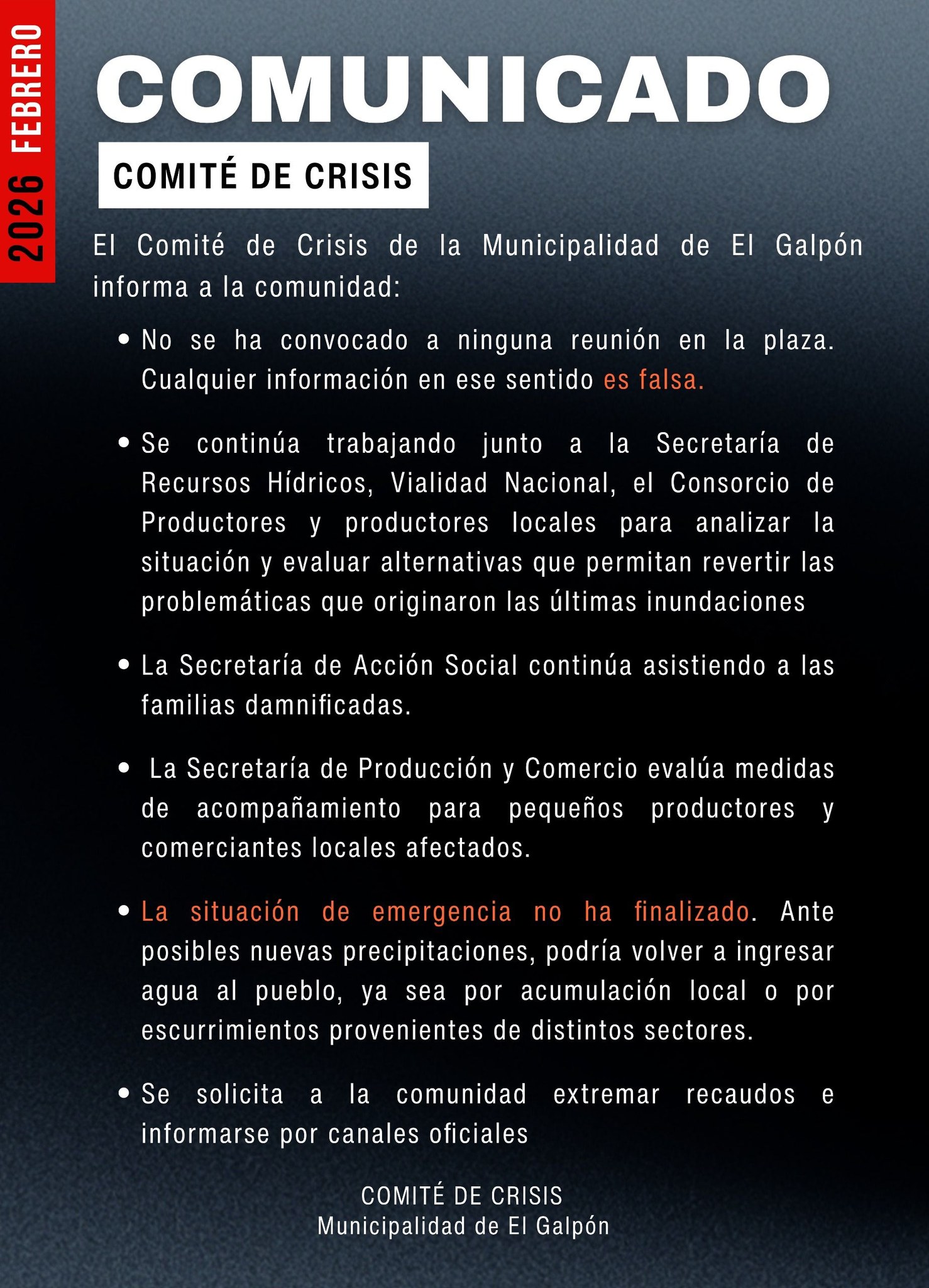 El Comité de Emergencia de la Municipalidad de El Galpón informa a la comunidad: