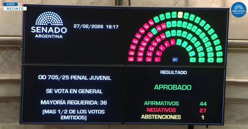 El oficialismo logró aprobar la Reforma Penal Juvenil, que, entre otras cosas, baja la edad de imputabilidad de 16 a 14 años. Fue con 44 votos a favor, 27 en contra y una abstención. Ahora, se debatirá la Reforma Laboral.