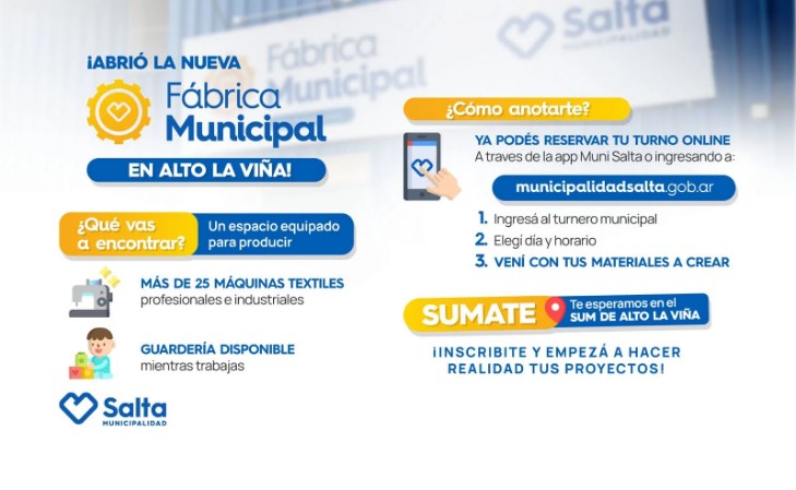 Se encuentra en barrio Alto La Viña, zona oeste. Los interesados ya pueden solicitar turnos, que serán de tres horas, a través de la App Muni Salta o a través de la web municipal. La fábrica funcionará de lunes a viernes de 8 a 20. También habrá una guardería.