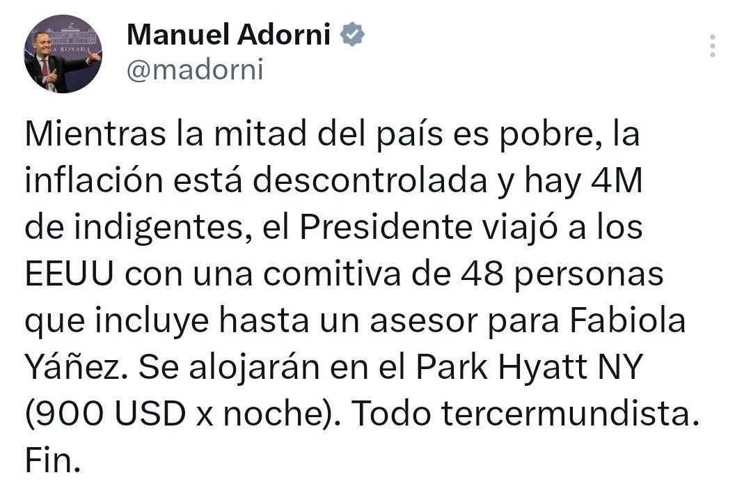 El escandalo escaló en las últimas horas en torno al jefe de Gabinete tras conocerse que su esposa había formado parte de la comitiva, cuando Adorni pretéritamente había fustigado duramente a Alberto Fernández en ocasión de que el ex mandatario había viajado con 48 personas, incluida la ex primera dama.