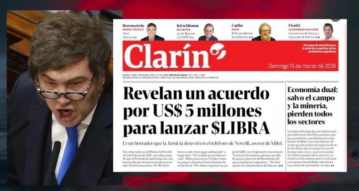 Javier Milei se sacó con la dura tapa del diario Clarín de este domingo que llevó como título principal la aparición de un documento extraído del celular de Mauricio Novelli que detalla un acuerdo con el presidente y su hermana para que a cambio de cinco millones de dólares promocionen la cripto $Libra.