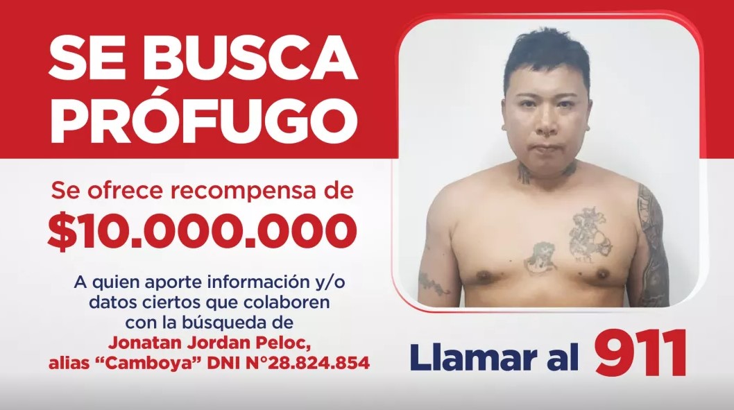 El Gobierno de la Provincia ofrece una recompensa de $10.000.000 para aquellas personas que aporten información relevante y verificable que permita dar con el paradero de Jonatan Jordan Peloc, alias “Camboya”, quien actualmente se encuentra prófugo de la justicia.